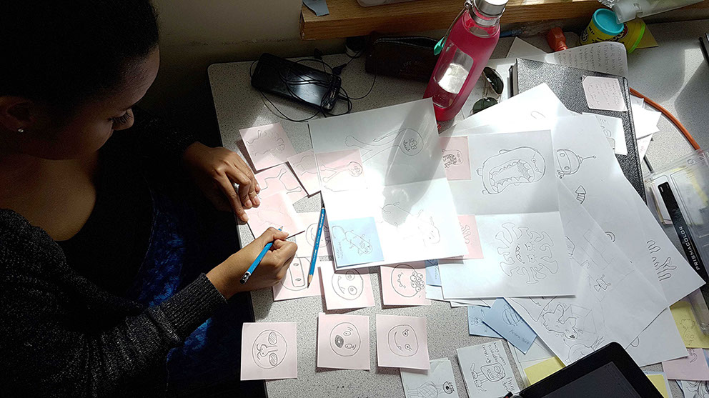 The toys were designed as a series of five fictional creatures with distinct personalities that elicit various emotional reactions in users. The goal was to develop soft, genderless (non-binary), anthropomorphic, interactive creatures that respond to a child’s touch with lights, vibrations and sounds. We looked at many sources of inspiration, including animals, robots, and monsters, and attempted to subvert the traditional genres by creating a more ambiguous family of creatures.
