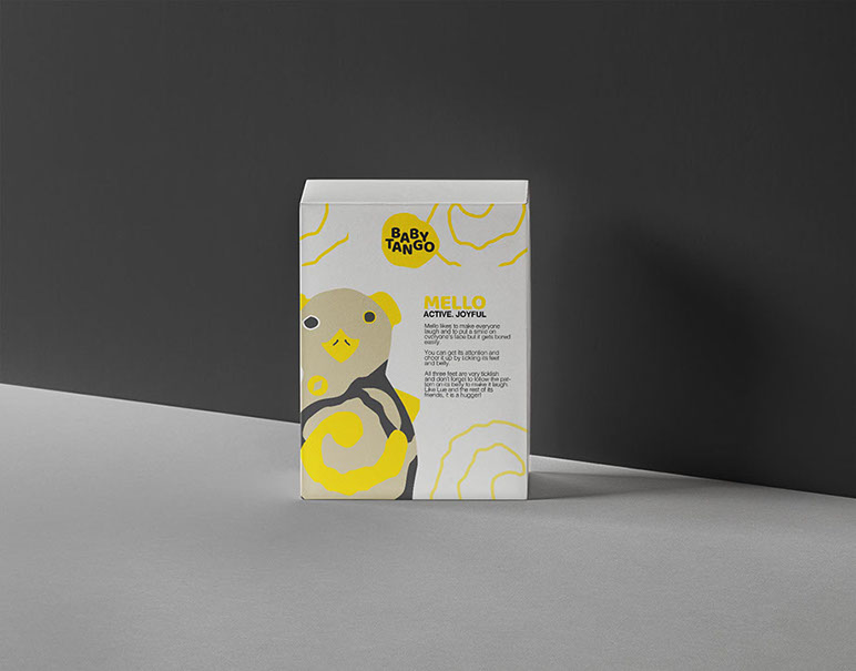 The name of the toys was change to BABY TANGO, a name that reflected more the nature of the toy and the interactivity of it. As part of the rebranding, a new logo was created with a colour that reflected the principle chracter of the toy, Mello, and an irregular typography to reflect the fun aspect of the toys.